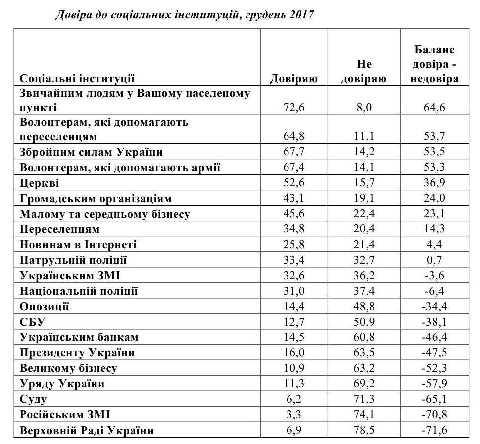 Всім іншим українці не довіряють трохи менше ніж повністю. Особливо низький рівень довіри до Верховної Ради України, довіряють 7%, не довіряють 79%, баланс –72%. Далі за рівнем недовіри йдуть російські ЗМІ, український суд (баланс –65%), уряд (–58%), великий бізнес (–52%), президент (–48%).
