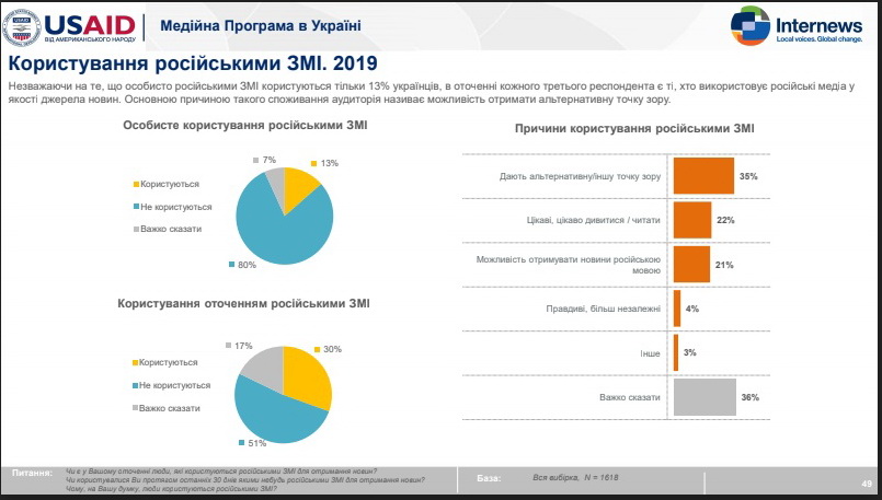 Серед причин інтересу до російських ЗМІ українці називають можливість ознайомитися з альтернативною точкою зору (35%), цікаве наповнення і подачу матеріалу (22%), можливість отримувати інформацію російською мовою (21%). 4% назвали російські новини "більш правдивими і незалежними", ніж українські. Більше третини (36%) не змогли сформулювати, чим їх приваблюють російські медіа.