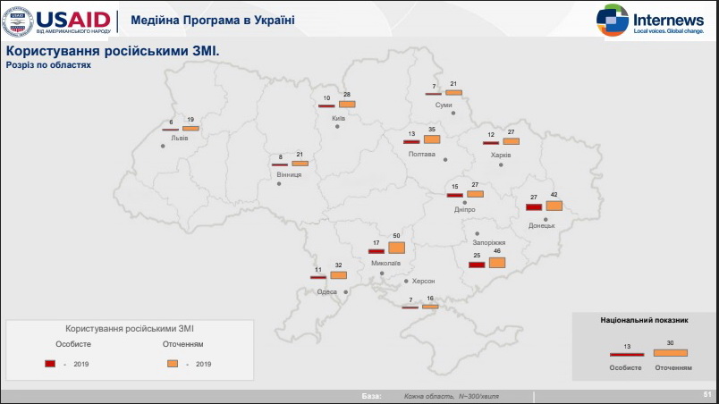 У регіонах найбільший відсоток споживачів російських новин було зафіксовано в Донецькій, Запорізькій, Миколаївській іа Дніпропетровській областях, найнижчий - у Вінницькій, Сумській і Львівській областях.