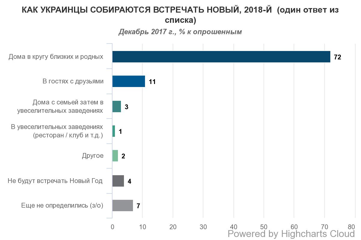 При цьому більшість українців (72%) мають намір зустріти черговий Новий Рік у колі сім'ї, кожен десятий (11%) в гостях з друзями, а ще 4% спочатку вдома, а потім у розважальних закладах або відразу в розважальних закладах.
