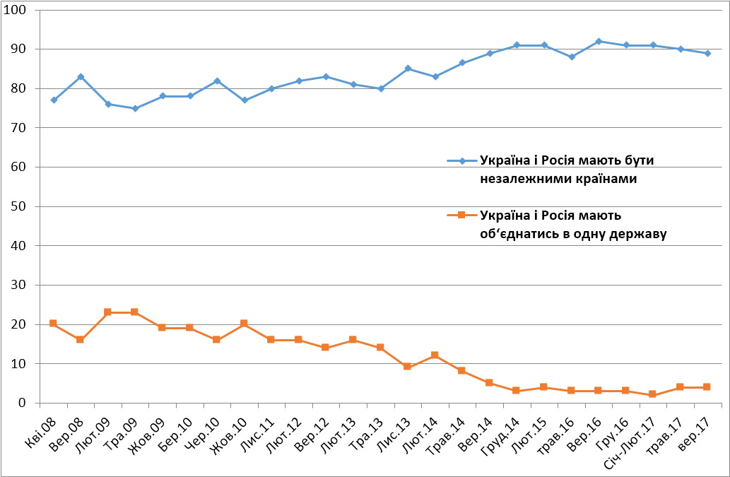 У вересні 2017 року 4% українців вважали, що Україні варто об'єднатися в одну державу з Росією, 89% респонденті переконані, що Україна має бути незалежною державою, свідчать дані опитування КМІС.