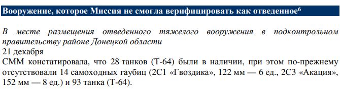 У документі, датованому 21 грудня, відзначається, що в місці відведення важкого озброєння виявлено 28 танків Т-64, а ще 93 одиниці були відсутні. Крім того, вдалося виявити 14 самохідних гаубиць.