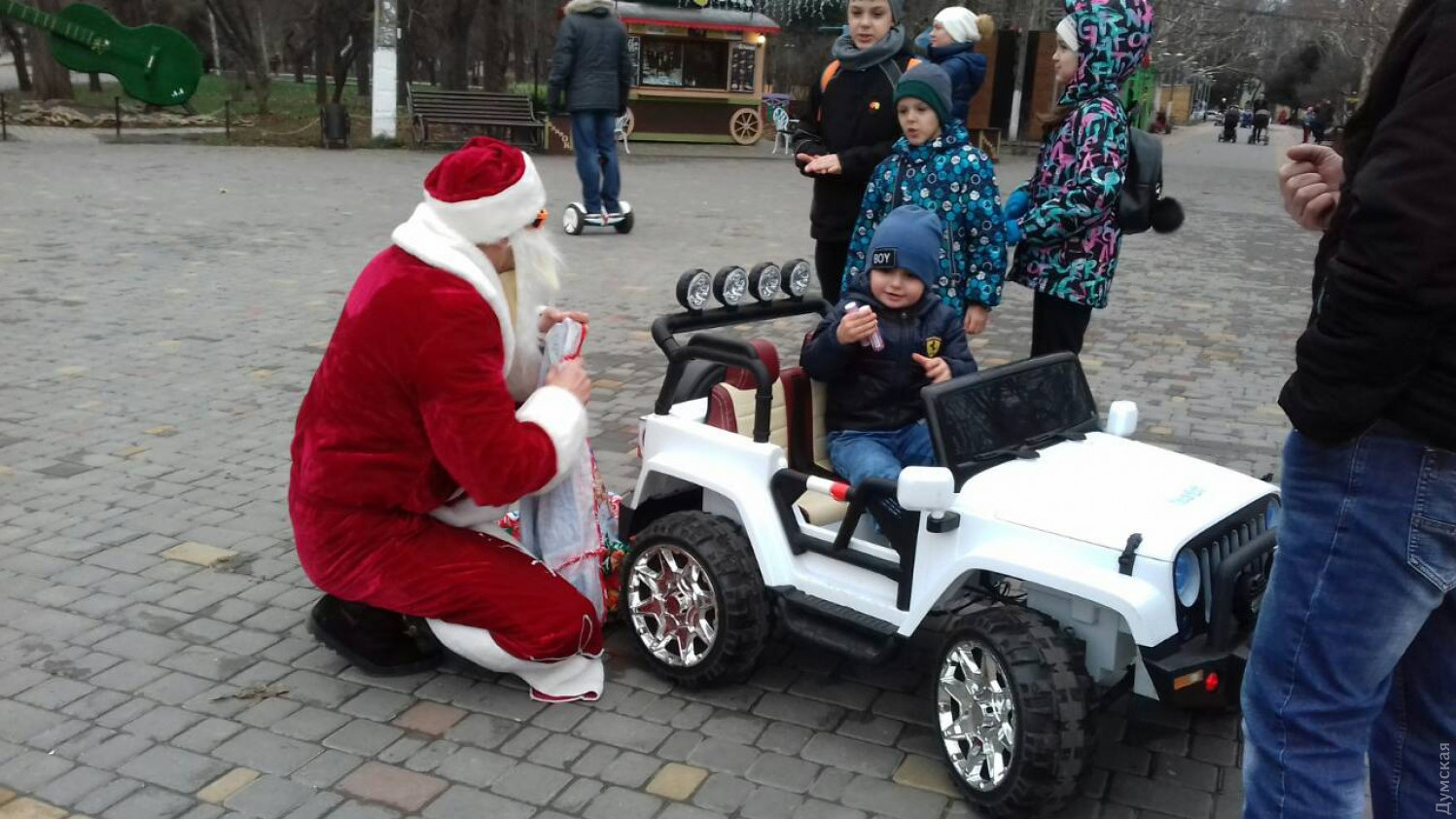 Чоловік у костюмі Діда Мороза, з великим мішком подарунків ходив по парку Горького і дворами в районі вулиці Космонавтів в Одесі і роздавав дітям подарунки за віршик чи пісеньку, повідомляє Думська.