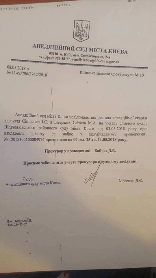 "Розгляд апеляційної скарги адвоката Синиченко В. С в інтересах Саїтова М. А. на постанову слідчого судді Шевченківського районного суду Києва від 03.05.2018 року про накладення арешту на майно у кримінальному провадженні №12018100100004974", - йдеться в документі.