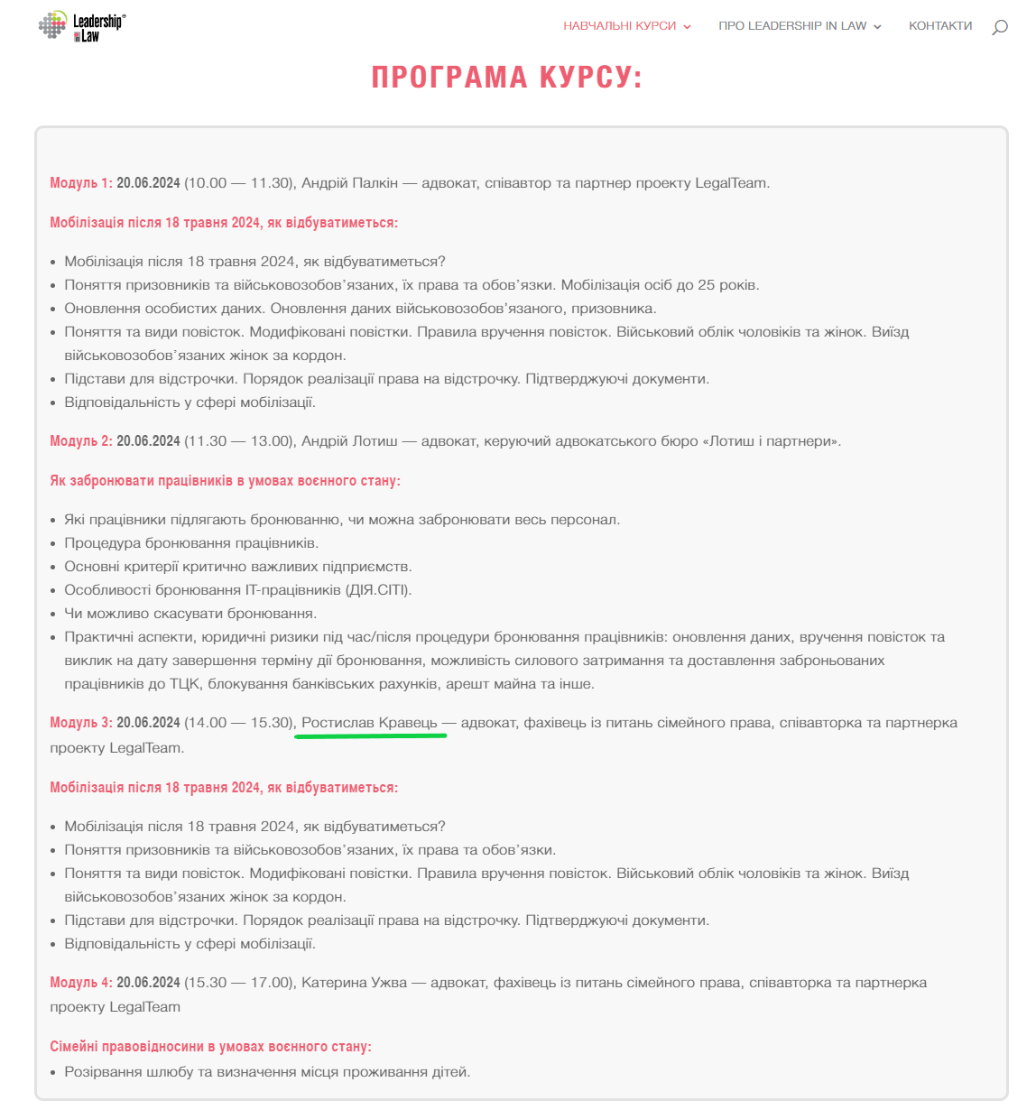На онлайн-курсі заходу Leadership Law для юристів та військових на тему «Військове право в умовах військового стану», який відбудеться 20 червня, одним із спікерів запросили адвоката Ростислава Кравця, який системно у своїх дописах критикує громадські ініціативи, захищає проросійські тези та займається дискредитацією судової системи України.