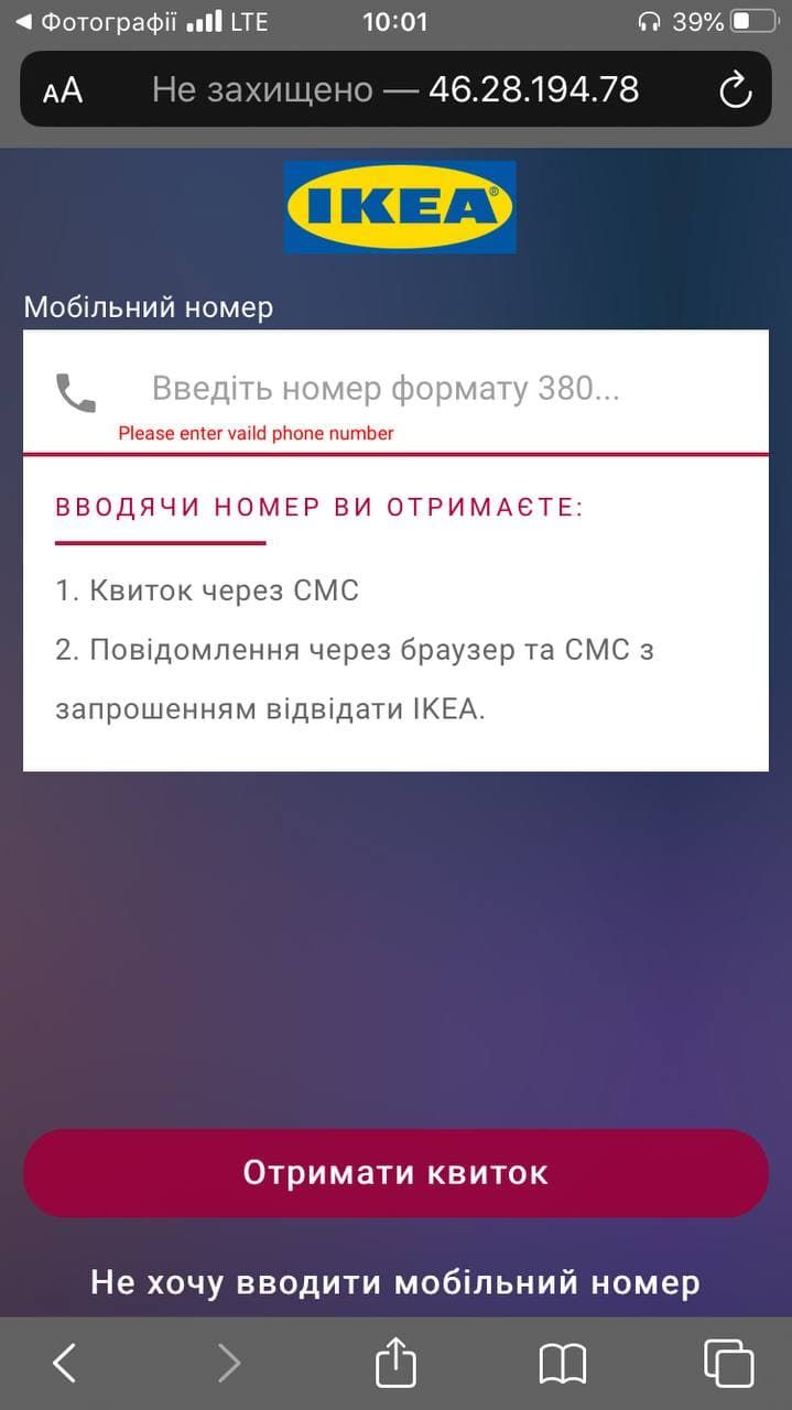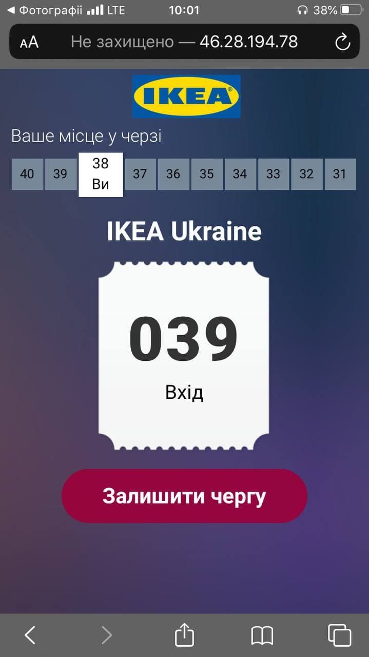 Відвідувачів пускають в магазин тільки в порядку електронної черги. Для цього потрібно ввести свій номер телефону і отримати QR-код зі своїм номерком. Тільки по ньому пускають в IKEA, щоб відстежувати кількість відвідувачів в магазині.