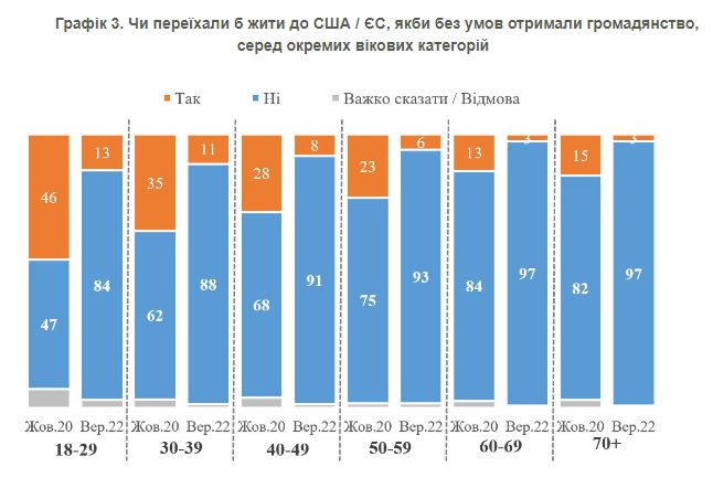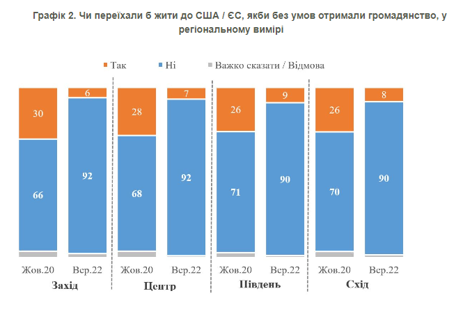 Готовність українців переїхати жити до США або країн Європейського Союзу у разі отримання громадянства цих країн за два роки знизилась у чотири рази. Такі дані опублікував Київський міжнародний інститут соціології, порівнявши опитування у вересні 2022 з аналогічним дослідженням у жовтні 2020 року.