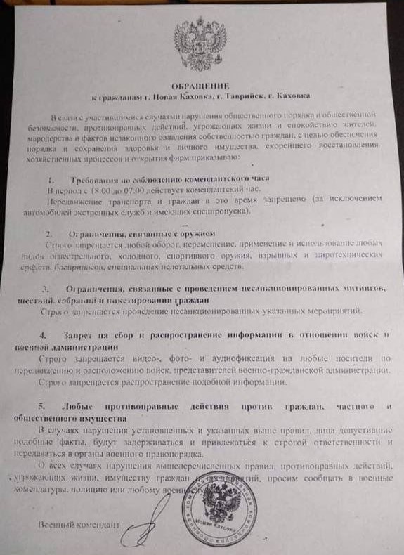 Російський ворог вирішив встановити незаконні обмеження в тимчасово окупованих містах Нова Каховка, Таврійськ та Каховка Херсонської області аби придушити спротив українських громадян окупації. Про це йдеться в так званому «зверненні» «військового коменданта» до жителів цих українських міст, яке опинилося в розпорядженні ZN.UA від власних джерел.