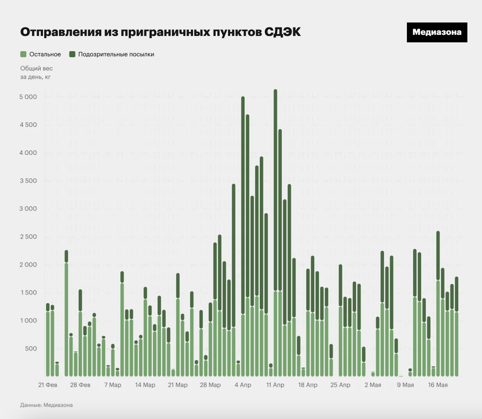 Обсяг підозрілих посилок збільшувався одночасно з відступом російських окупантів із північних областей України. Якщо 25 березня російські військові відправили посилки загальною вагою 338 кг, то 29 — більше тонни, а 2 квітня — більше 2,5 тонн.