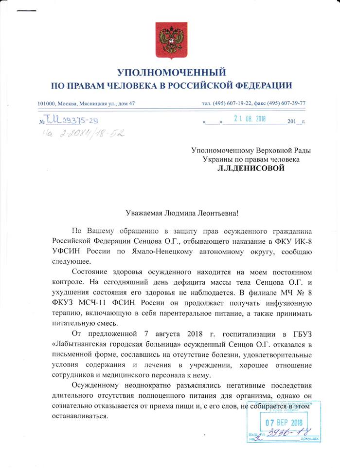 "Тетяна Москалькова повідомляє, що стан здоров'я у Олега не погіршився. Йому продовжують колоти внутрішні ін'єкції, а також надають підтримуючу суміш. Олег знову відмовився від госпіталізації до Лабитнангської міської лікарні. Він, нібито, посилається на відсутність хвороби та задовільні умови утримання і лікування в медичній частині колонії. Але ж ми усі добре знаємо, істинну причину його відмови. Оскільки в міській лікарні до нього ставляться жахливо. Йому не надають належної медичної допомоги і тиснуть психологічно", - зазначила Денісова.