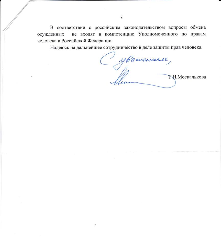 Вона також зазначила, що на питання якнайшвидшого обміну політв'язнями російський омбудсмен вкотре повідомила, що немає таких повноважень. За словами Денісової, детальної інформації щодо стану здоров'я Сенцова та інших політв'язнів з відповідними підтверджуючими документами досі немає.