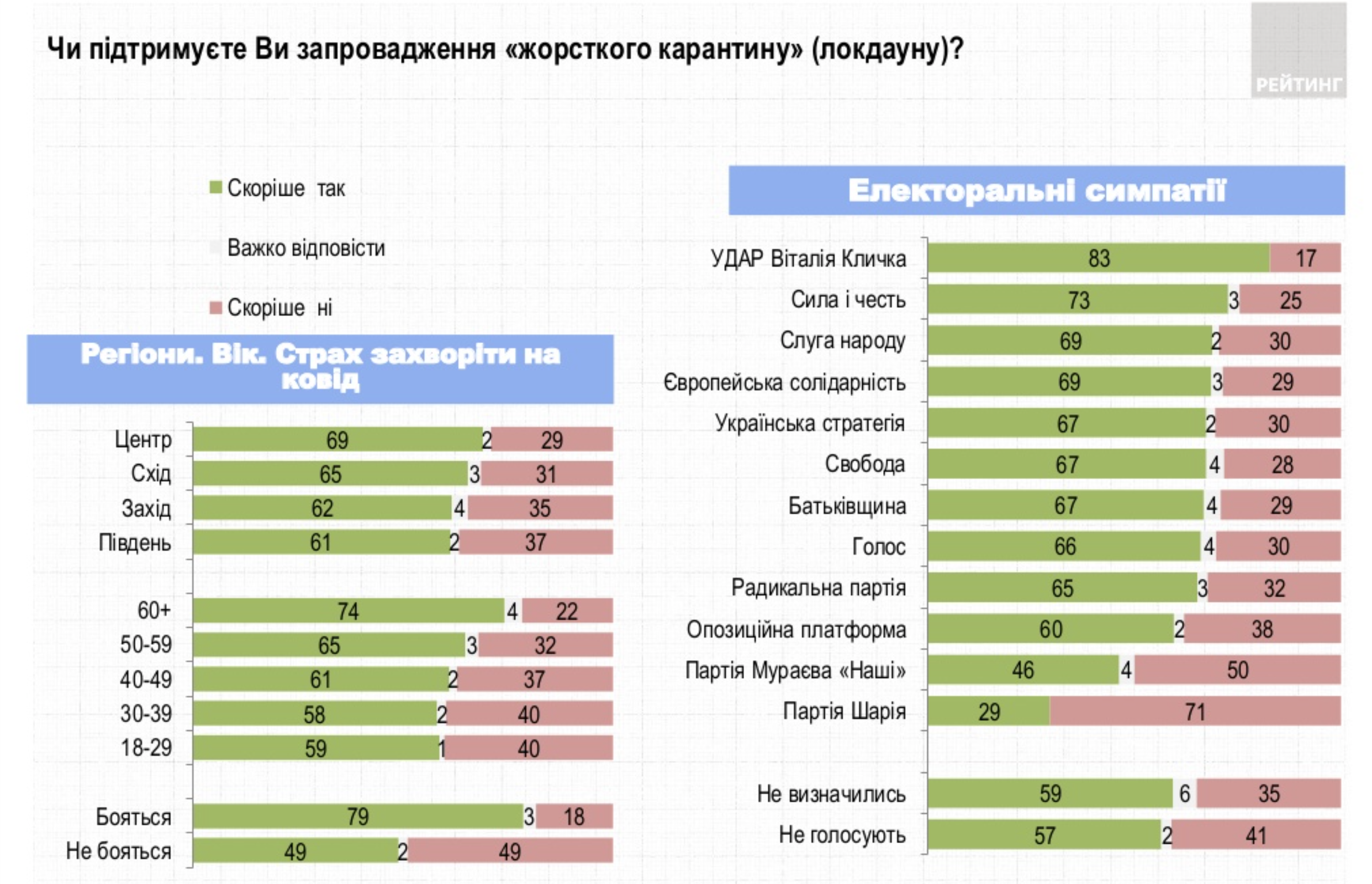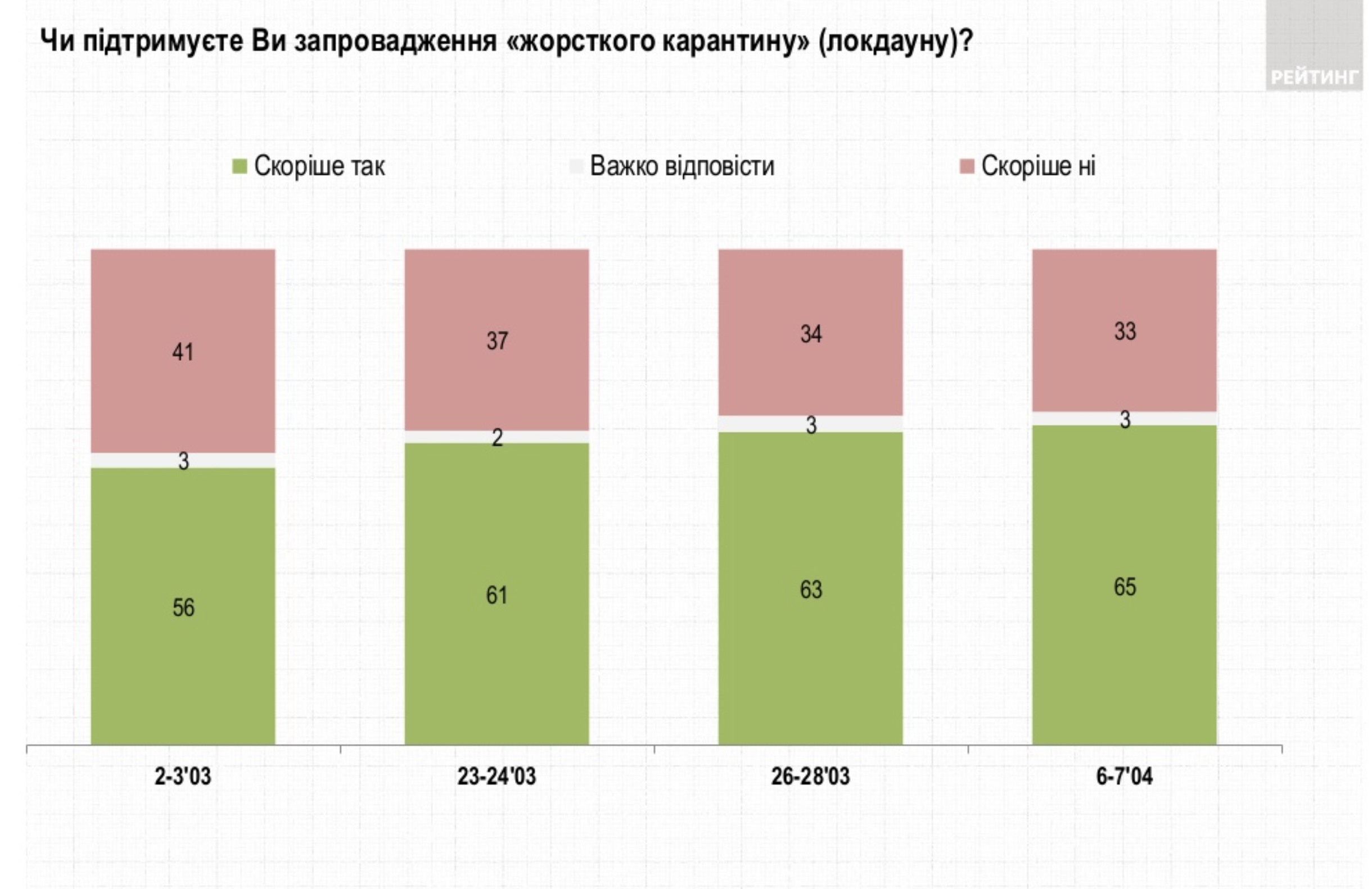 Запровадження «жорсткого карантину» (локдауну) підтримує 65% опитаних українців, 33% – з ними не згодні. З початку березня підтримка карантину зросла з 56 до 65%. Про це свідчать результати опитування Соціологічної групи "Рейтинг".