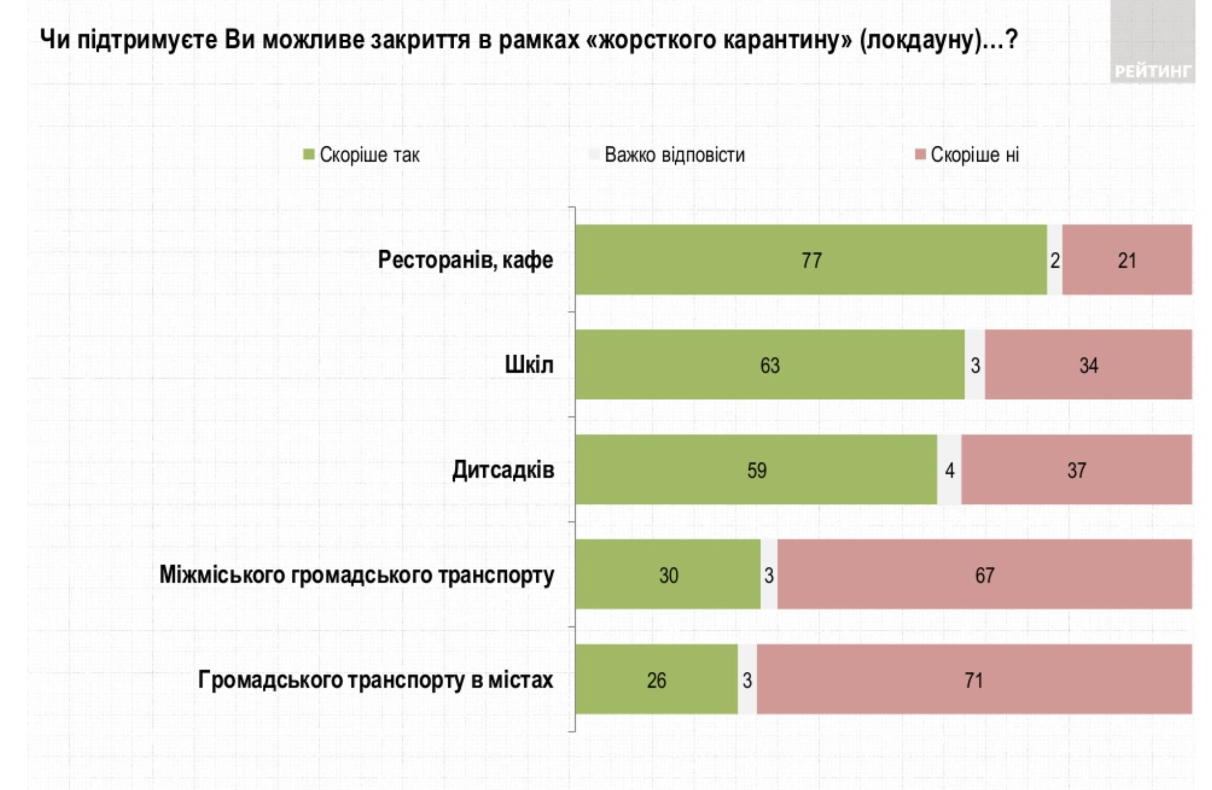 77% українців підтримують закриття ресторанів та кафе в рамках «жорсткого карантину», 63% – закриття шкіл, 59% – дитсадків. Натомість закриття міського та міжміського транспорту не підтримують майже 70%.