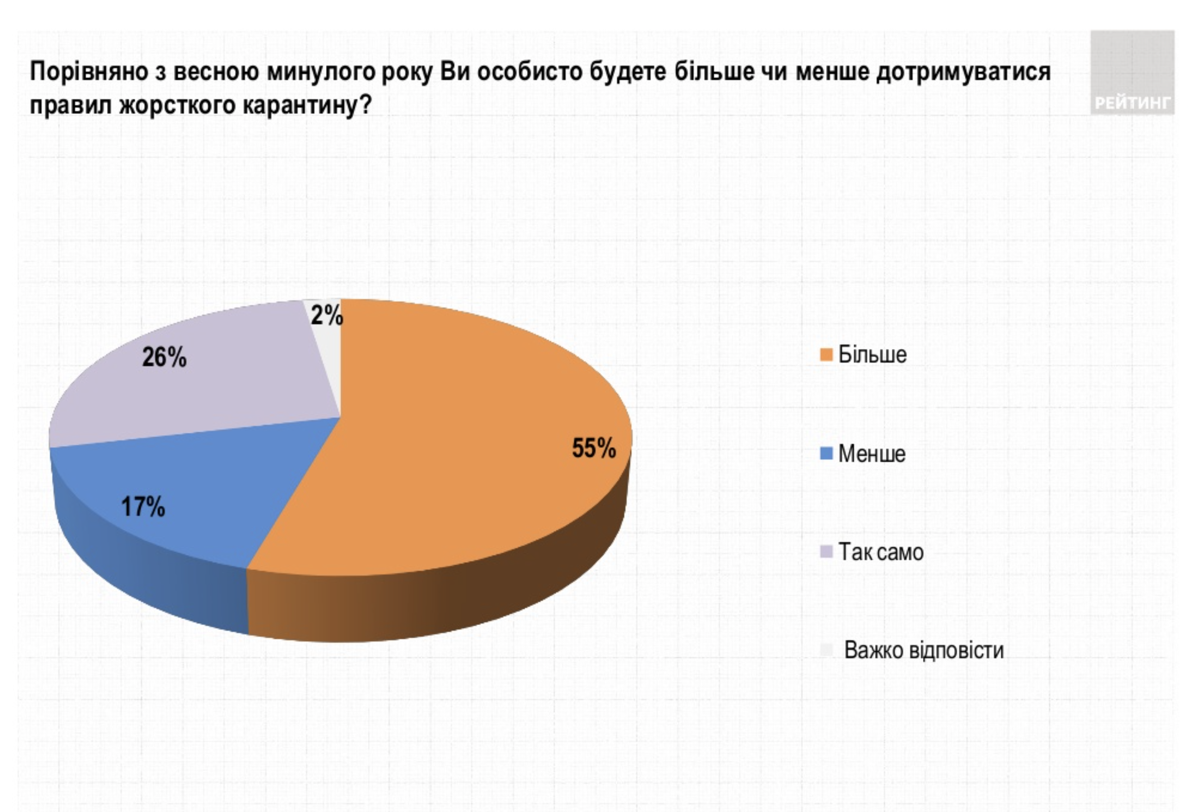 Крім того, 55% опитаних заявили, що будуть більше дотримуватися правил «жорсткого карантину» аніж весною минулого року. 17% – сказали, що робитимуть це менше, 26% – так само.
