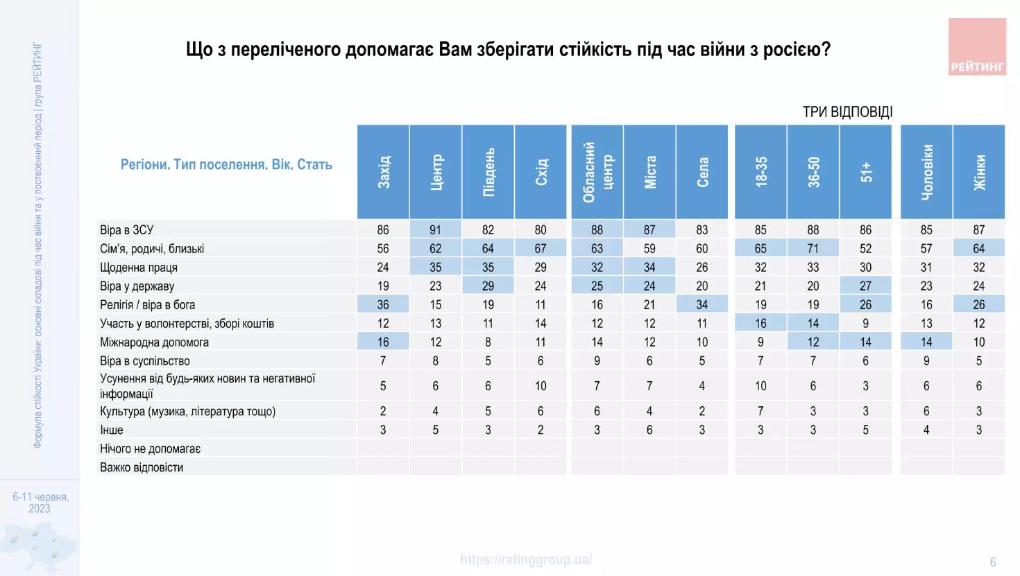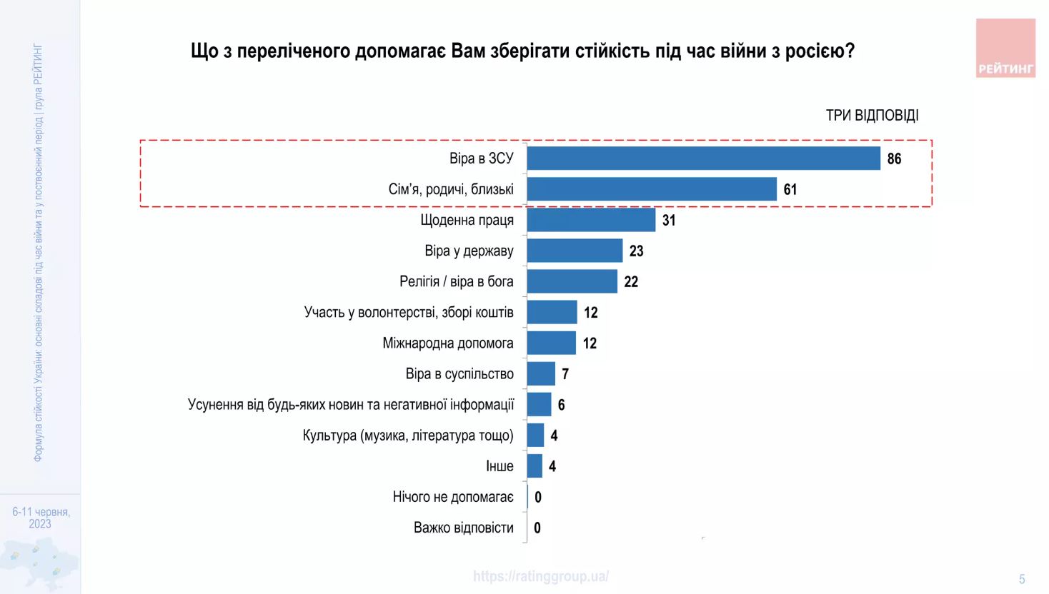 Водночас 86% опитаних зазначили, що віра в ЗСУ для них є основним фактором, який допомагає зберігати стійкість під час війни з РФ. Для ще 61% респондентів таким фактором є сім’я та близькі.