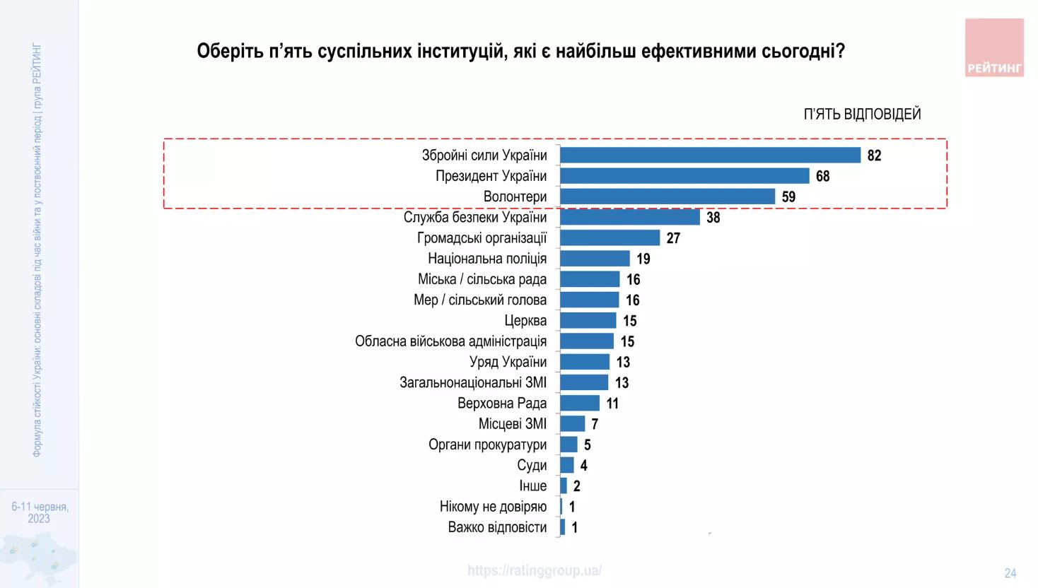 Більшість українців вважають, що сьогодні найбільш ефективною інституцією в Україні є Збройні Сили, йдеться в результатах опитування Соціологічної групи «Рейтинг». Таку відповідь соціологам дали 82% респондентів.