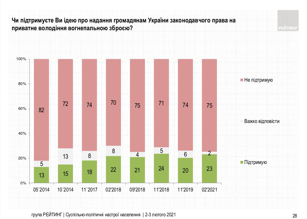 Право приватних осіб на вогнепальну зброю підтримали 23% опитаних, проти висловилися 75%, вагаються з відповіддю 2%.