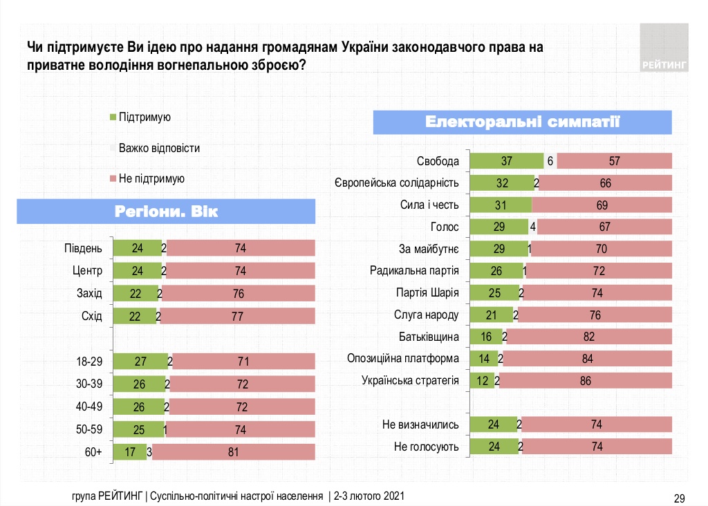 Найбільше право на зброю підтримують виборці партії "Свобода" – 37%, а 57% проти. Найменший рівень підтримки – серед виборців "Української стратегії Гройсмана" (12%), ОПЗЖ (14%) і "Батьківщини" (16%).