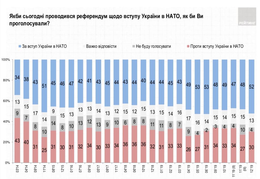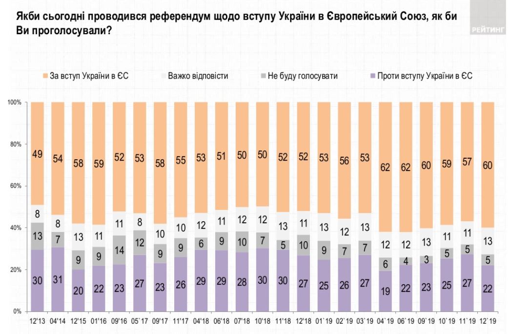 Зазначається, що 60% опитаних підтримують вступ України до Євросоюзу (у листопаді – 57%), 52% підтримують вступ до НАТО (48% – у листопаді).