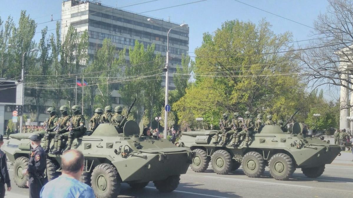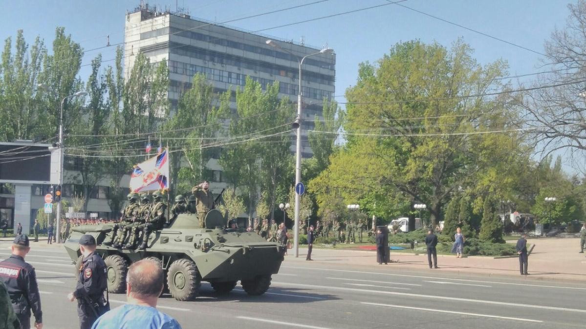 В окупованому Донецьку провели репетицію параду до Дня перемоги. Центральними вулицями проїхала бронетехніка, також у місті бойовики розвісили прапори "ДНР" і плакати з георгіївськими стрічками. На фото помітно, що зацікавленої публіки репетиція параду не зібрала, крім солдатів, на фото переважає нудьгуюча поліція.