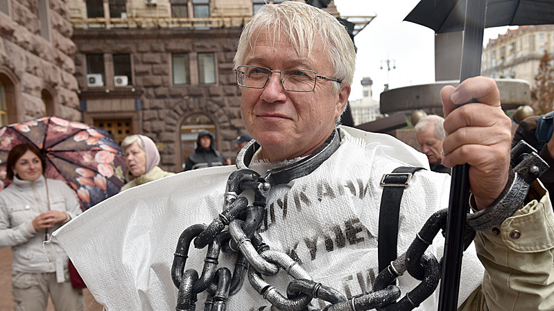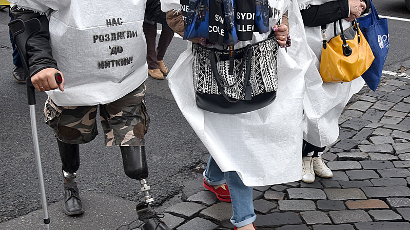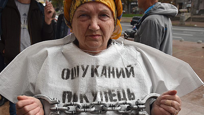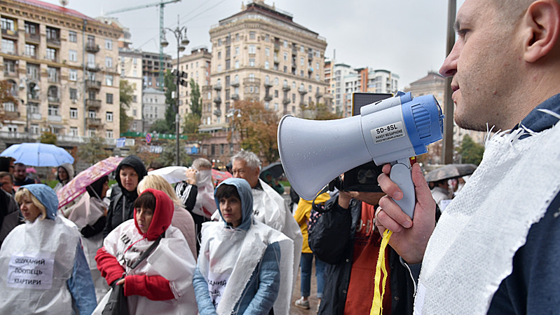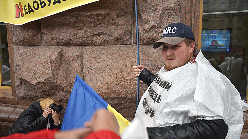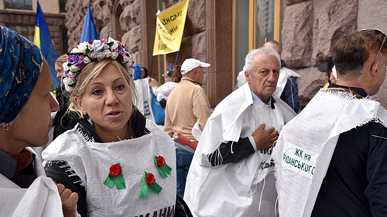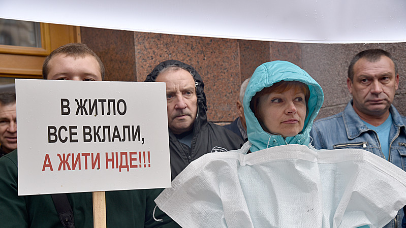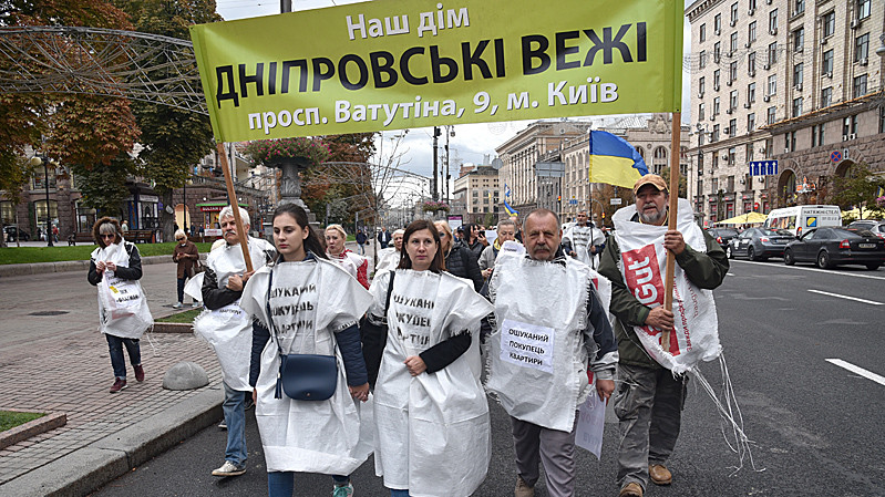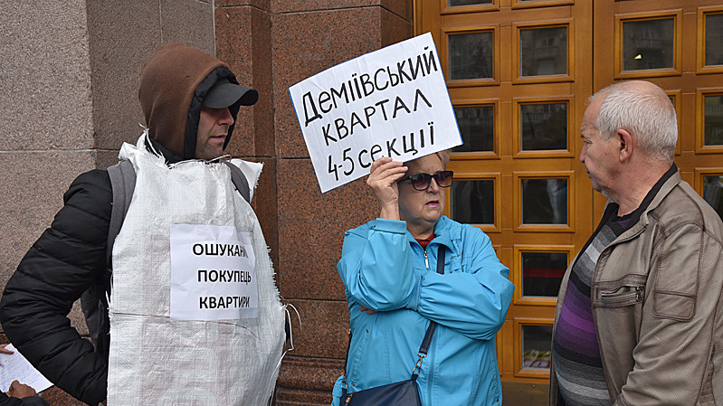 Учасники акції на знак протесту одягли мішки для будівельного сміття з написами "Ошуканий покупець квартири" та "Нас роздягли до нитки". Учасники пройшли від будівлі Київської міської державної адміністрації до будівлі Офісу президента України.