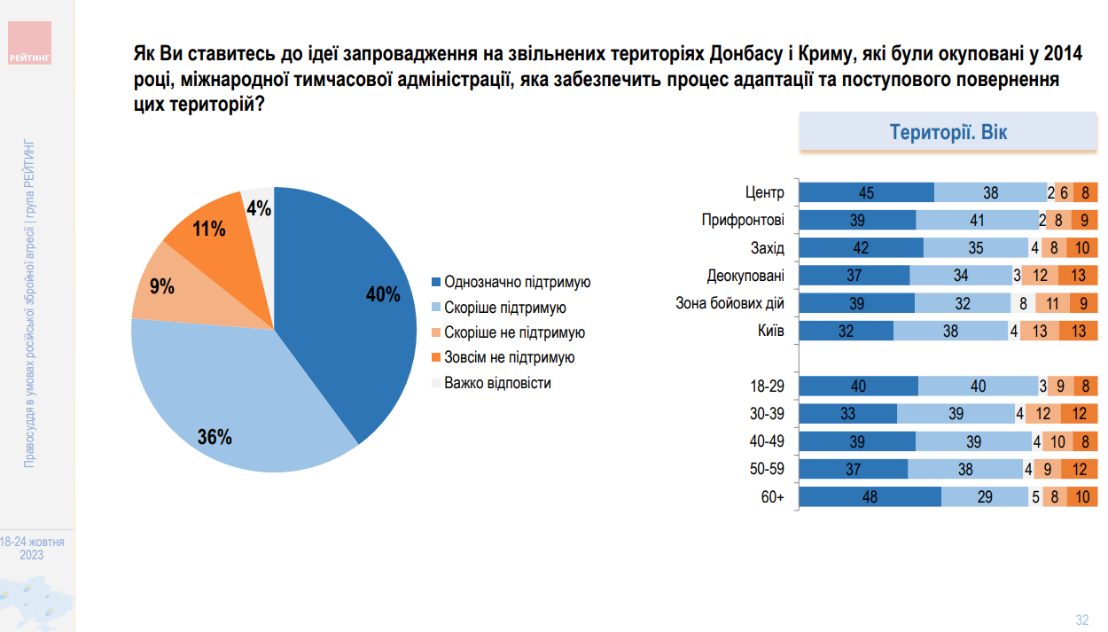 Три чверті українців підтримують ідею запровадження міжнародної тимчасової адміністрації для забезпечення процесу адаптації на звільнених територіях Донбасу та Криму після повернення територій. Проти такої ідеї виступають 20 % громадян, йдеться в соціологічному дослідженні групи «Рейтинг».