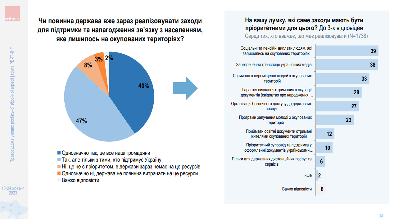 На думку більшості опитаних, держава повинна вже зараз починати на практиці заходи для підтримки та налагодження зв’язку з населенням, що лишилось на окупованих територіях. Хоча 47 % вважають, що такі ініціативи мають бути спрямовані лише на тих, хто підтримує Україну, 40 % кажуть, що їх варто розгорнути для всіх, хто лишився на окупованих територіях. 8 % вказали, що такі заходи не є пріоритетними, ще 3 % вважають, що держава взагалі не має витрачати на це ресурси.