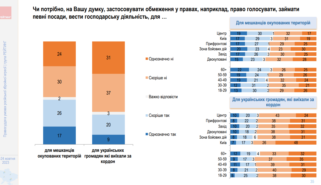 Понад половина українців схиляються до думки, що не варто застосовувати обмеження в правах (право голосувати, займати певні посади, вести господарську діяльність) для мешканців окупованих територій, однак 43 % кажуть, що це було б доречним. Водночас про доцільність обмеження прав для українських громадян, що виїхали за кордон заявили 29 % респондентів, проти такої ініціативи — 68 %.