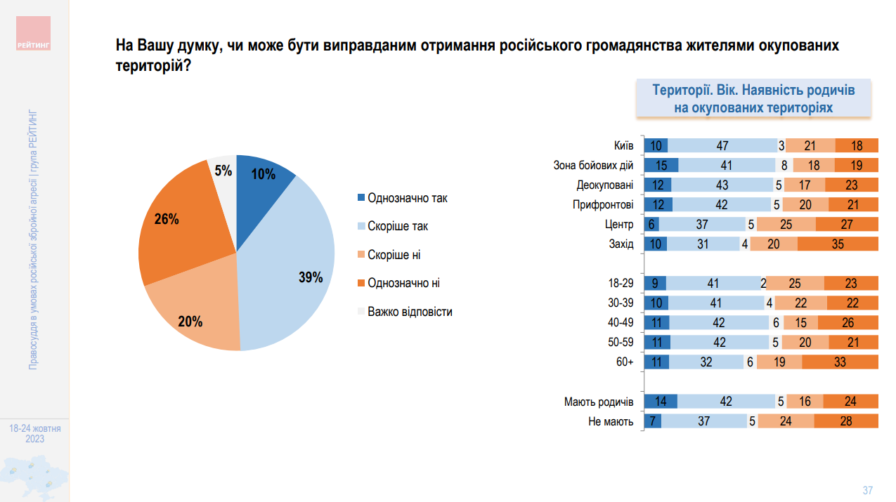 Частіше не погоджуються з можливістю виправдання отримання російського громадянства респонденти, що не мають родичів на окупованих територіях, мешканці центральних та західних регіонів.