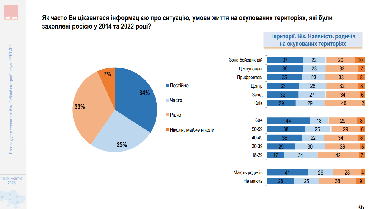Водночас 40% громадян рідко, або навіть ніколи, не цікавляться життям на окупованій території України, і лише 25% кажуть, що цікавляться життям на ТОТ часто.