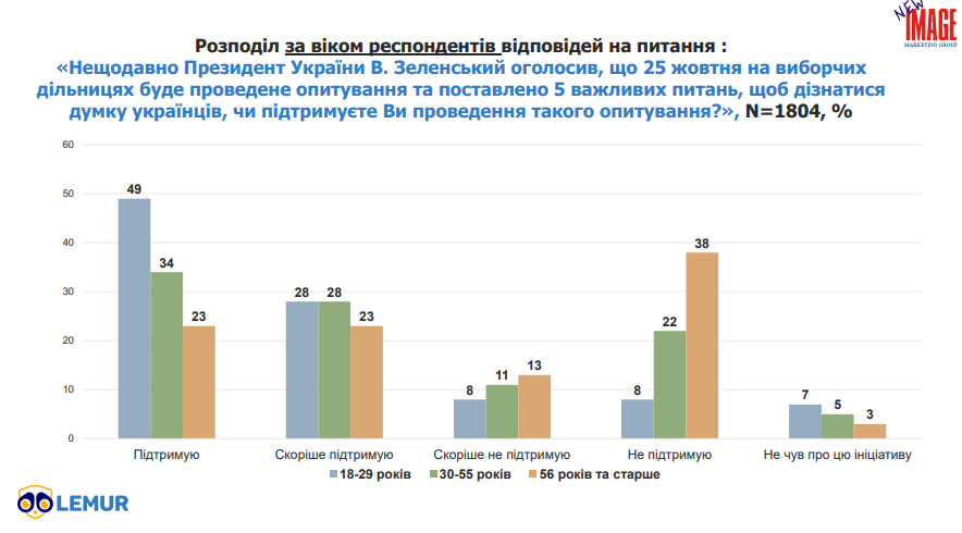 Так результати соціологічного дослідження, проведеного New Image Marketing Group, свідчать, що серед тих, хто підтримує “всеукраїнське опитування”, 49% - це українці віком 18-29 років, 34% - 30-55 років, 23% - 56 років та старші.