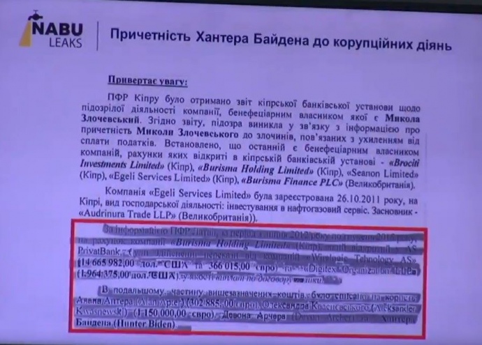 За словами Деркача, ці документи свідчать про підконтрольність НАБУ окремому представникові дипмісії посольства США, про тиск посольства США з 2016 по 2018 роки. На правоохоронців України, про втручання правоохоронних органів і держчиновників України на виборах США в 2016 році, а також про можливі корупційні дії Байдена і його сина Хантера.