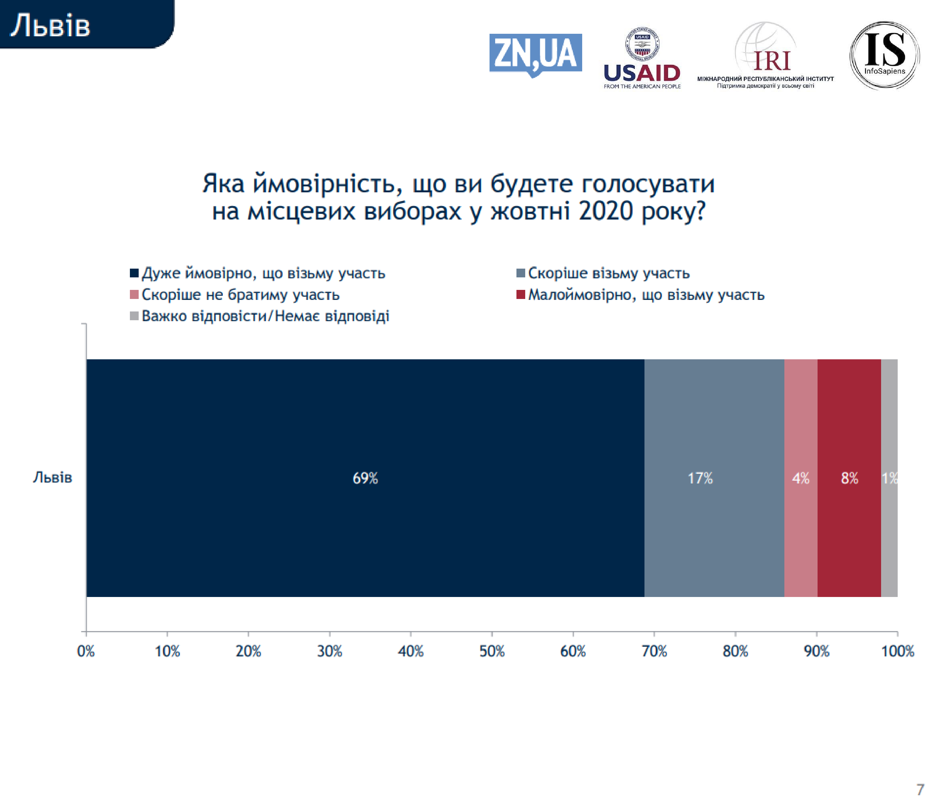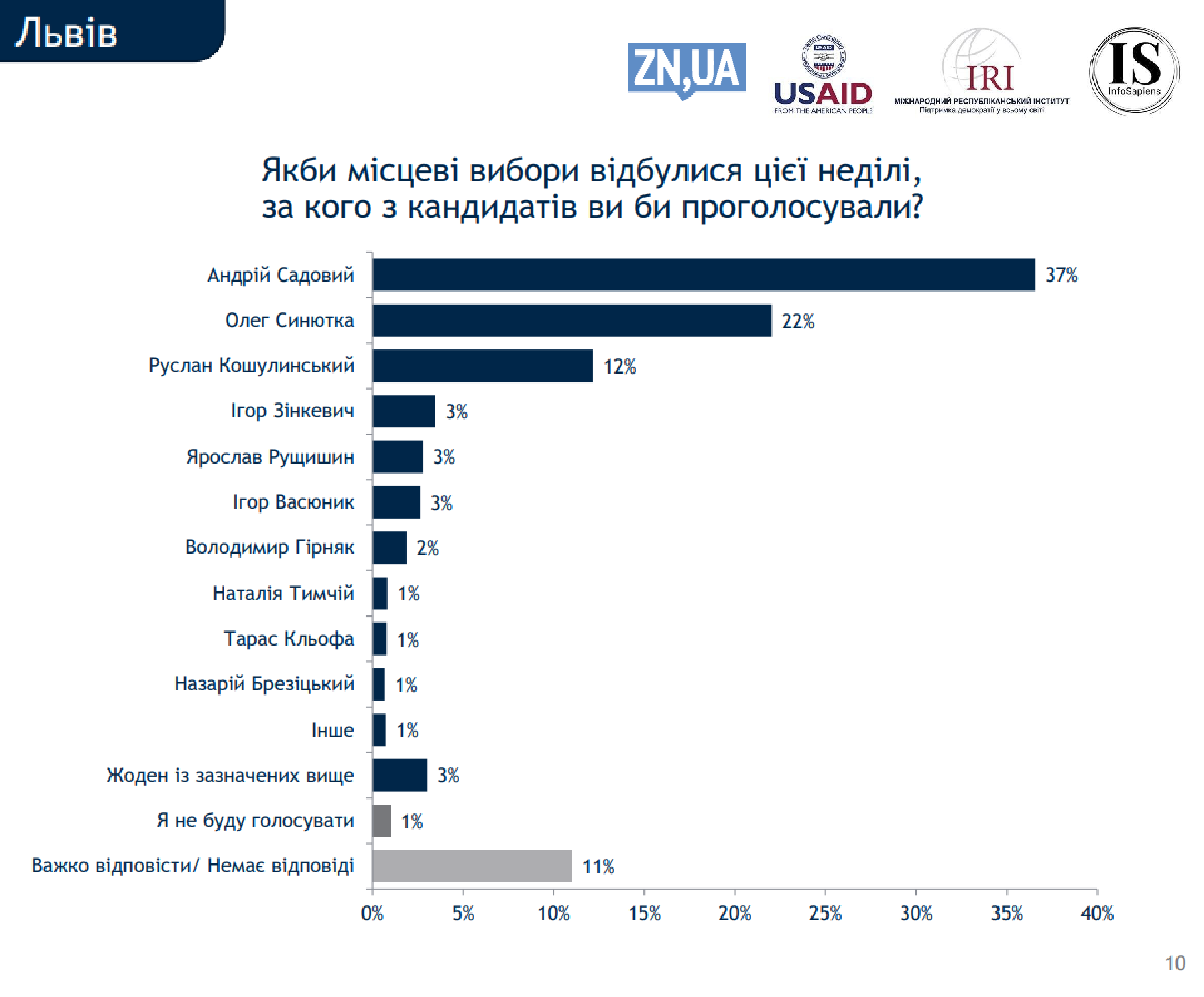 У інших кандидатів на пост голови Львова Ярослава Рущишина 3% підтримки; депутат Львівської міської ради (УКРОП Коломойського) Ігор Зінкевич 4%, військовий медик, депутат Львівської міськради Тарас Кльофа поки з 1%. По Дмитру Добродомову соціологи даних поки не зафіксували.Оглядачі ZN.UA припускають, що швидше за все, після виборів "Самопоміч" (12%) увійде в щільну співдружність з патріотичними політичними силами, в тому числі і з "Української Галицької партією", яка теж є проєкт чинного мера Львова. У неї зараз 5% підтримки.