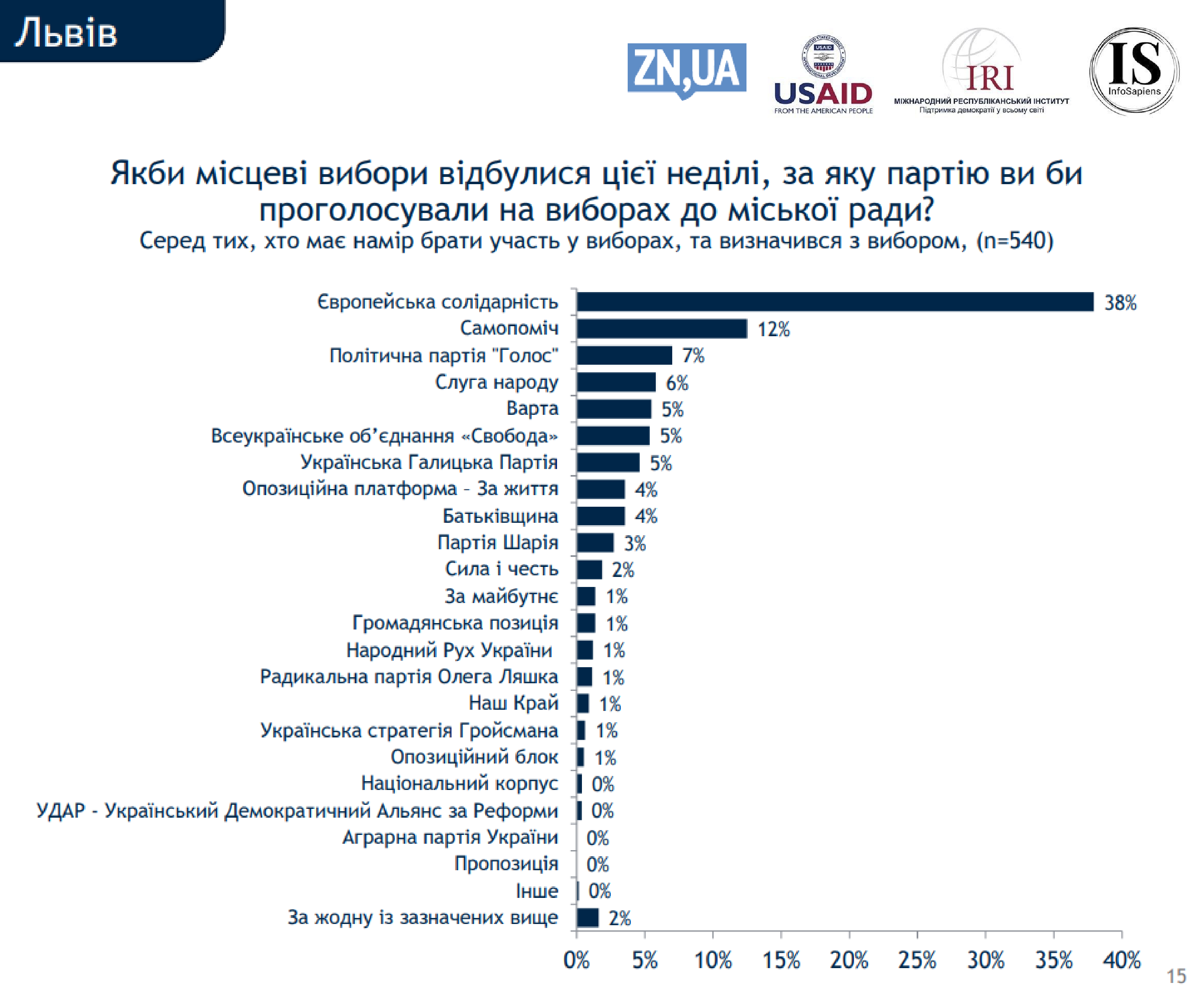 Партія "Слуга народу", у якій в даний час 6% підтримки стане якоюсь силою в місті, але все впирається в прізвища в її списку. У "Європейській солідарності" рейтинг 38%, у "Свободи" 5%, як і у місцевої партії "Варта".