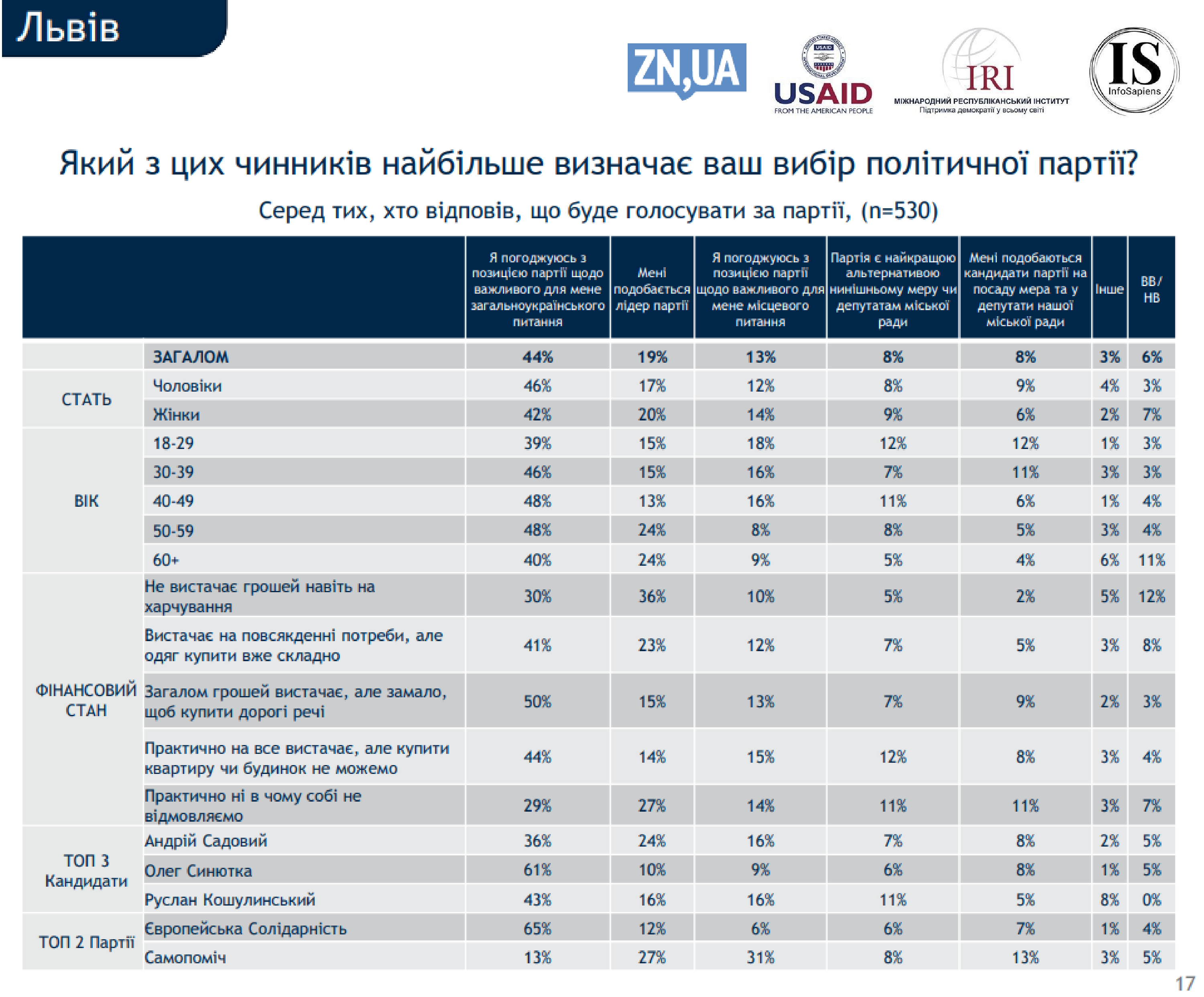 У Львові партія Андрія Садового "Самопоміч" впевнено тримається за рахунок рейтингу і авторитету градоначальника, але згідно з даними опитування IRI, проведеного компанією Info Sapiens, у Садового сьогодні 42%, а у "Самопомочі" - 12% підтримки населення.