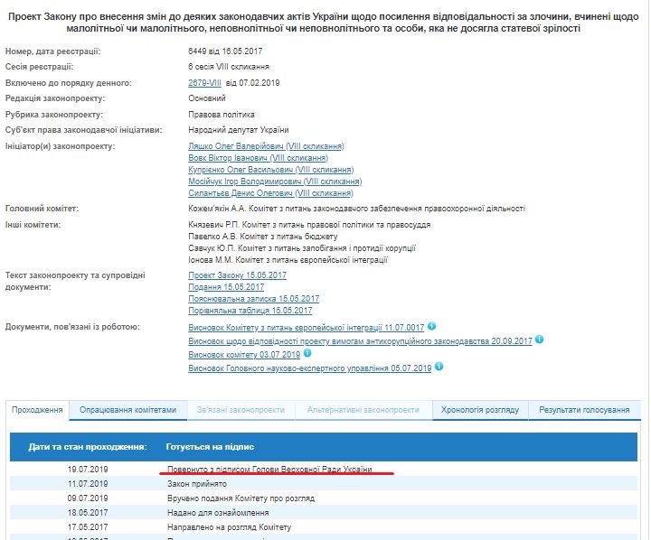 Спікер Верховної ради Андрій Парубій у п'ятницю, 19 липня, підписав законопроект №6449 про відповідальність за зґвалтування та розбещення неповнолітніх, який передбачає примусову хімічну кастрацію. Про йдеться у повідомленні на сайті парламенту.