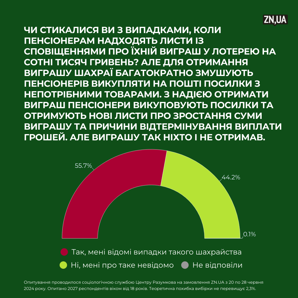 Зокрема, громадянам поставили запитання: «Чи стикалися ви з випадками, коли пенсіонерам надходять листи зі сповіщеннями про виграш у лотерею на сотні тисяч гривень? Але для отримання виграшу шахраї багаторазово змушують їх викуповувати на пошті посилки з непотрібними товарами. Сподіваючись отримати виграш, пенсіонери викуповують ці посилки й отримують нові листи про зростання суми виграшу та причини відтермінування виплати грошей. Але виграшу так ніхто й не отримав». Ствердно на нього відповіли 55,7% респондентів. Ще 44,2% зазначили, що не стикалися з таким.