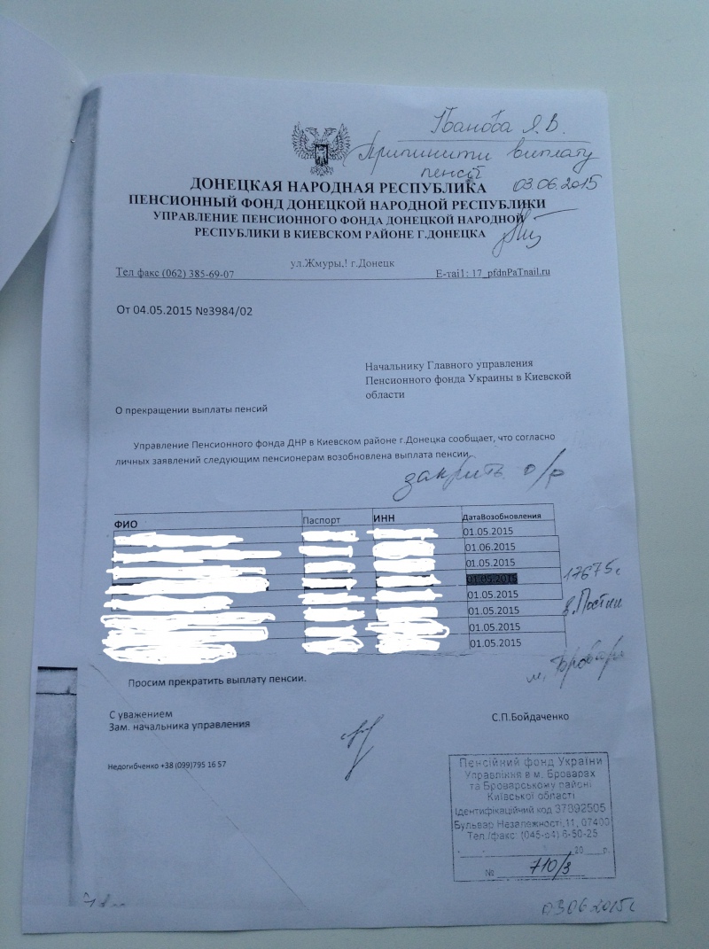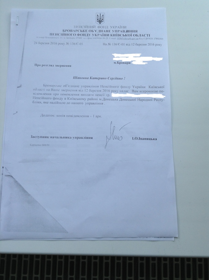 "Пенсійний фонд України в Київській області надає ксерокопію повідомлення про відновлення виплати пенсії у Київському районі р. Донецька "Донецької Народної республіки", яке надійшло до нашого управління", - йдеться в листі громадянину за підписом заступника начальника управління Броварського об'єднаного управління Пенсійного фонду України у Київській області В. А. Іваницької.