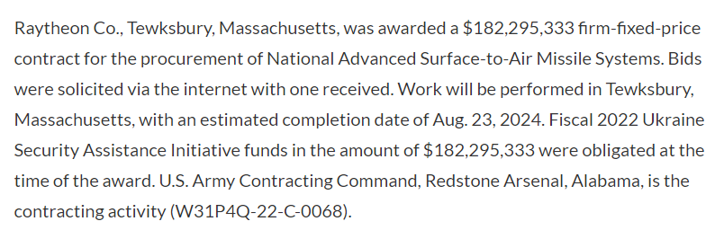 Міністерство оборони США уклало контракт із компанією Raytheon на закупівлю зенітних ракетних комплексів NASAMS для України. Сума контракту – 182 млн доларів, кошти закладено у пакет військової допомоги для нашої країни.