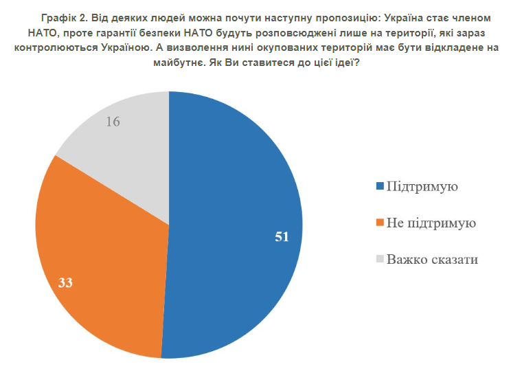 При цьому 51% опитаних українців підтримують варіант, при якому Україна стає членом НАТО, але гарантії безпеки розповсюджуються лише на нині підконтрольні уряду території. Разом з цим визволення окупованих Росією територій відкладається на майбутнє. Не підтримують подібний сценарій 33%.