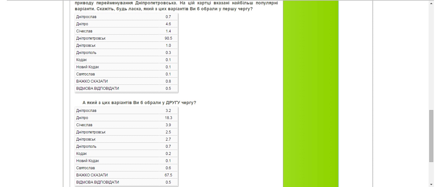 За збереження назви "Дніпропетровськ" виступає 90% городян, стверджує КМІС. При цьому, друге місце в опитуванні зайняла назва "Дніпро", однак вона набрало лише 4,5% голосів.