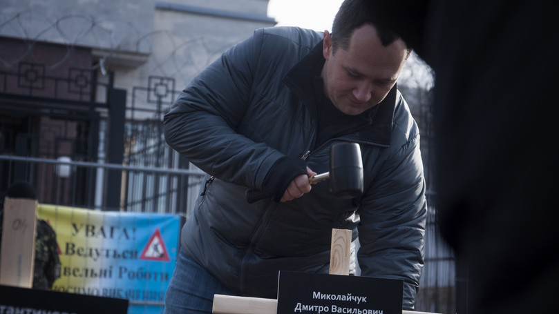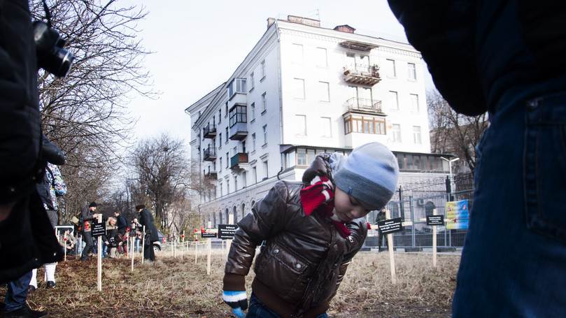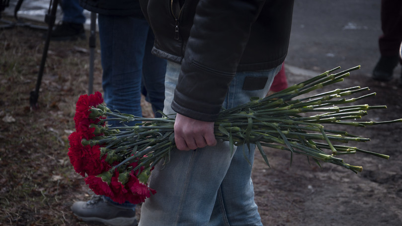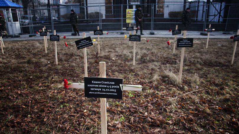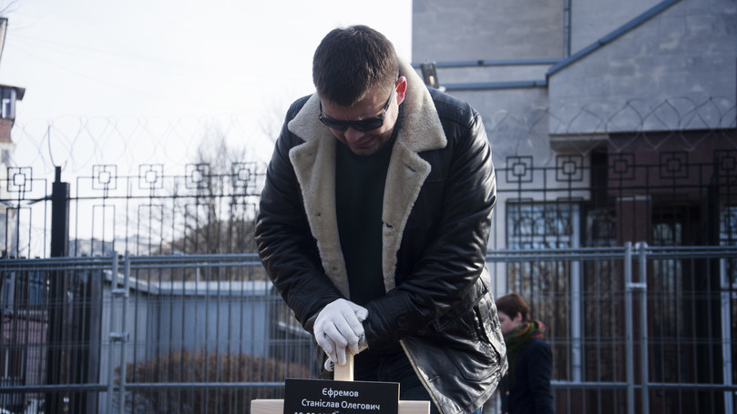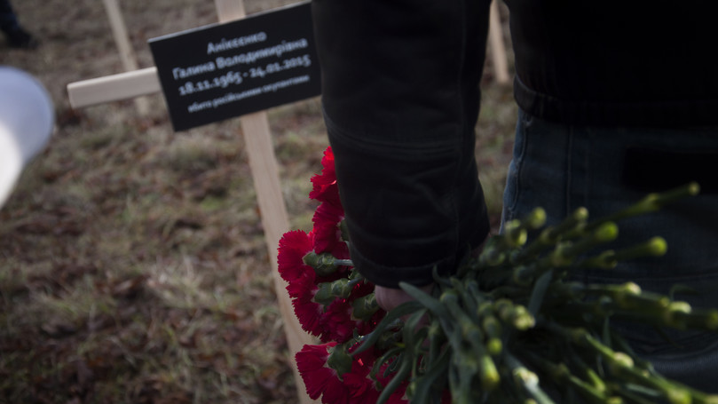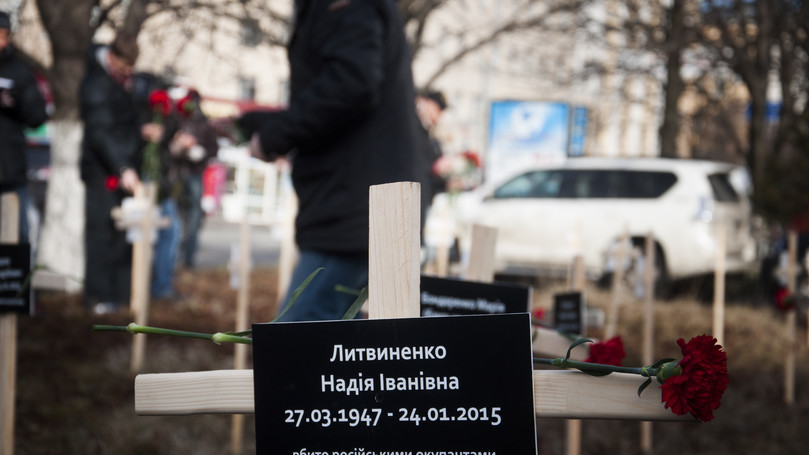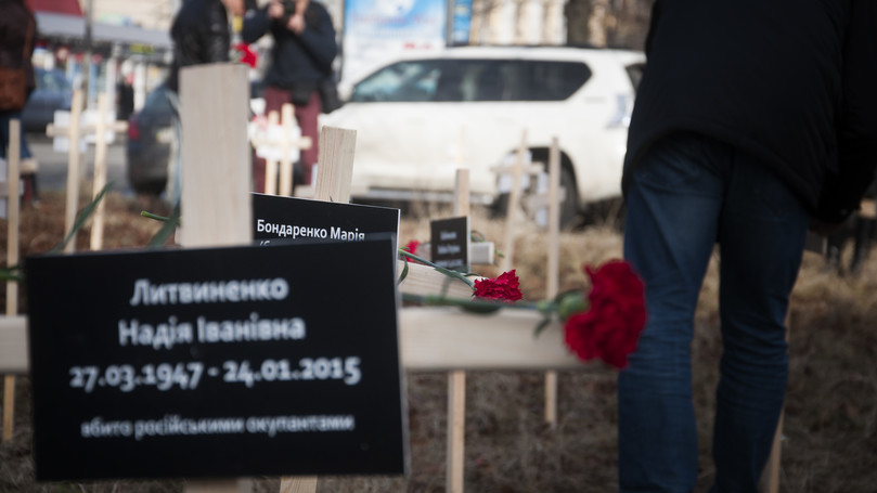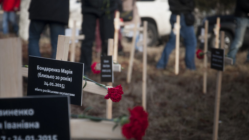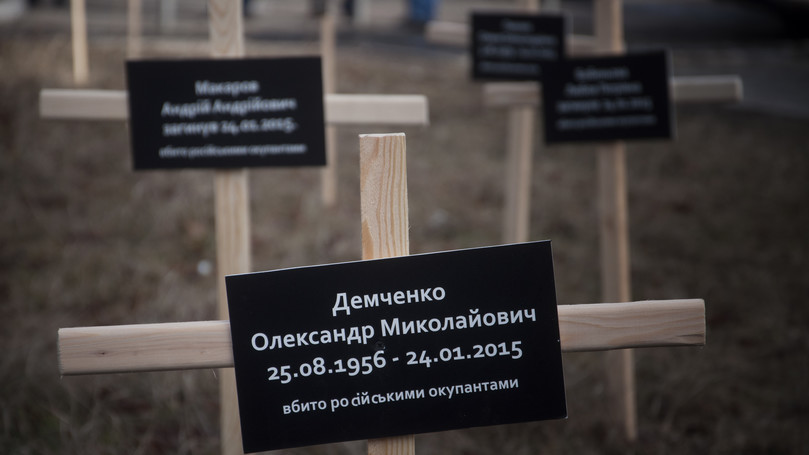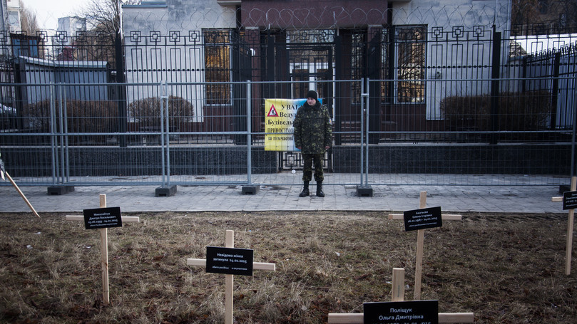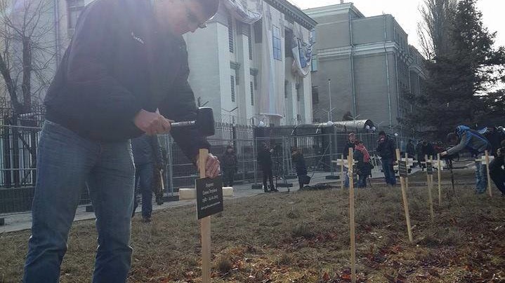 У неділю, 1 лютого, активісти встановили пам'ятні хрести з іменами загиблих під час обстрілу Маріуполя під будівлею посольства Російської Федерації у Києві.