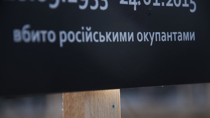 На табличках, розташованих на хрестах, вказані імена і дати загиблих в Маріуполі. Також на кожній табличці є приписка: "Вбито російськими окупантами".