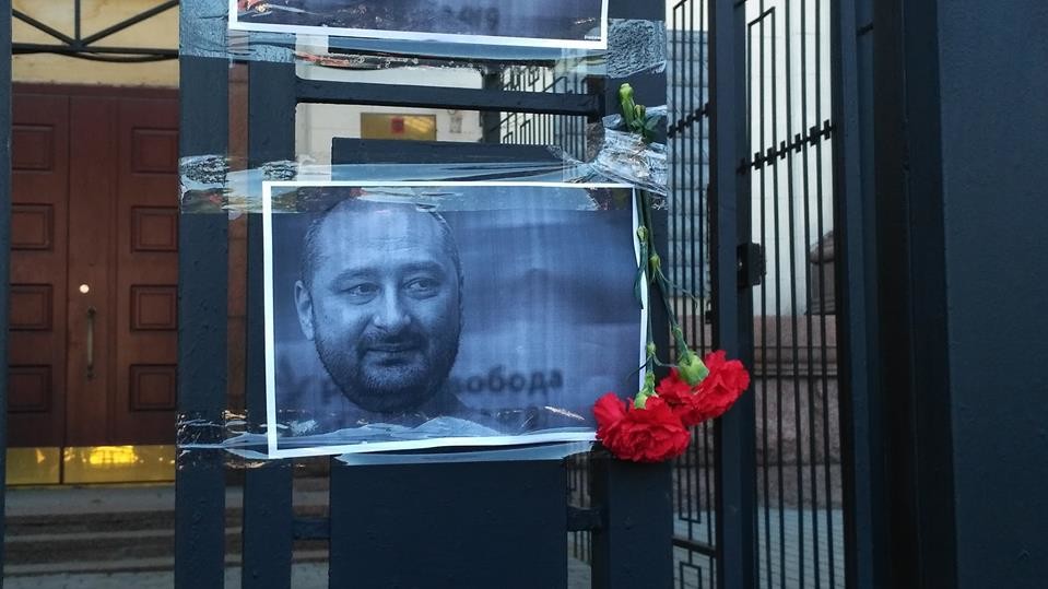 Під посольством Російської Федерації в Києві через вбивство журналіста Аркадія Бабченка зібралися його колеги. Учасники акції повісили на паркан посольства фотографії загиблого журналіста і поруч поклали квіти. Ідея принести фотографії належить знайомому Бабченка – журналісту Павлу Новікову.