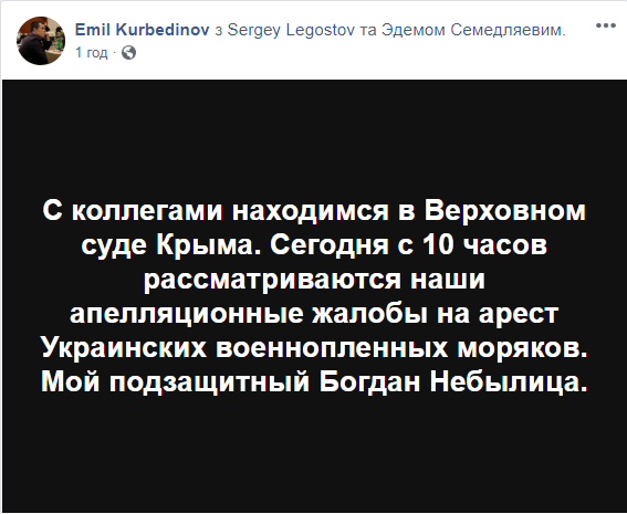 "З колегами знаходимося у Верховному суді Криму. Сьогодні з 10 години розглядаються наші апеляційні скарги на арешт українських військовополонених моряків", - написав Курбединов.