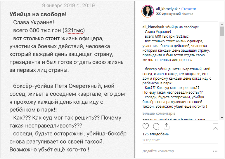 "Вбивця на волі! Слава Україні! Всього 600 тисяч гривень ($ 21 тисяч) – от скільки коштує життя офіцера, учасника бойових дій, людини, яка кожен день захищала країну, президента та була готова віддати своє життя за перших осіб країни", - написала Аліна Хмелюк.