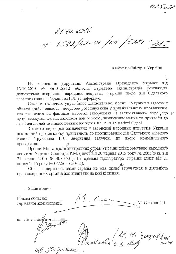 Наголошується, що в переданому листі Саакашвілі звітує перед Кабміном про розгляд звернення депутата Сольвара з приводу причетності Труханова до трагедії 2 травня в Одесі. Залишений Саакашвілі підпис написана кирилицею, в той час як підпис на анкеті залишена на грузинській мові.