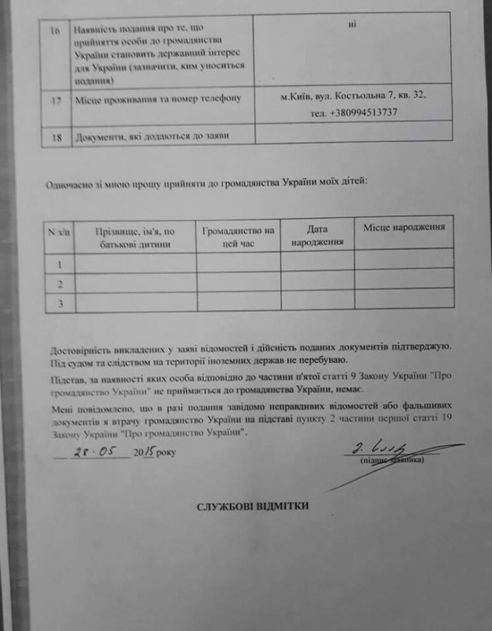 Підпис на анкеті для отримання громадянства України, яку нібито заповнив 3 відрізняється від підпису, яку він ставив під документами, обіймаючи посаду голови Одеської ОДА.