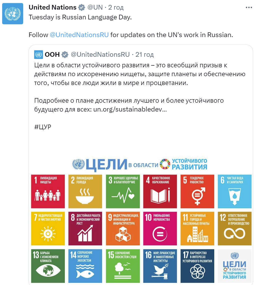 Зокрема, у Twitter ООН представники організації станом на 9 ранку жодним словом не обмовилися про дії російських терористів, хоча про підрив ГЕС стало відомо ще вночі. Натомість організація не забула відзначити день російської мови.