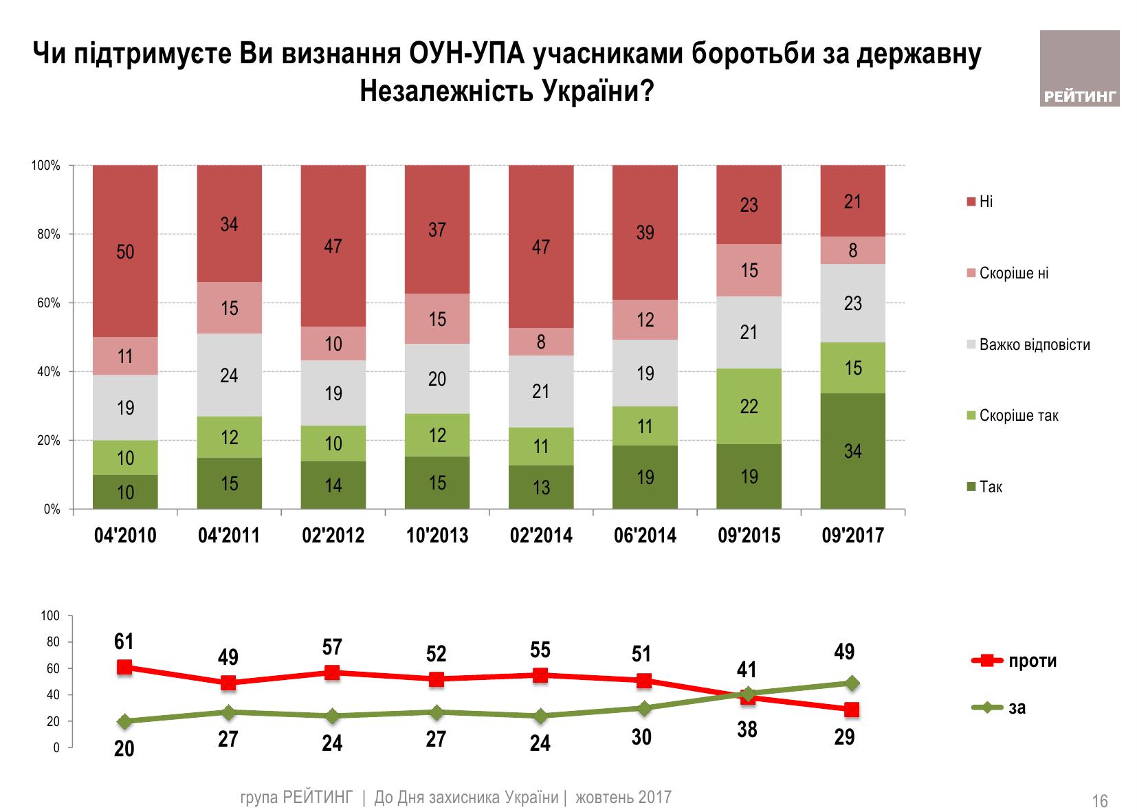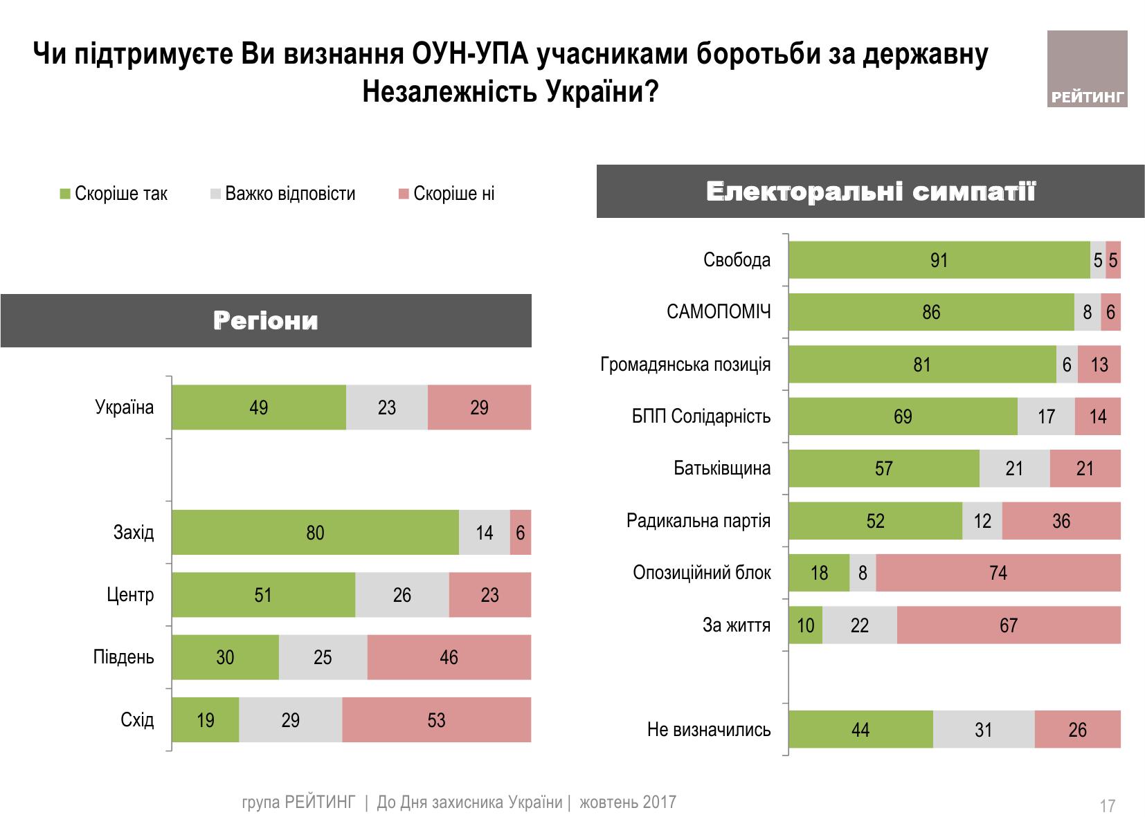 Половина українців (49%) підтримують ідею визнання ОУН-УПА учасниками боротьби за державну незалежність України, 29% - не підтримують, 23% не визначилися з відповіддю, свідчать дані опитування Соціологічної групи "Рейтинг".